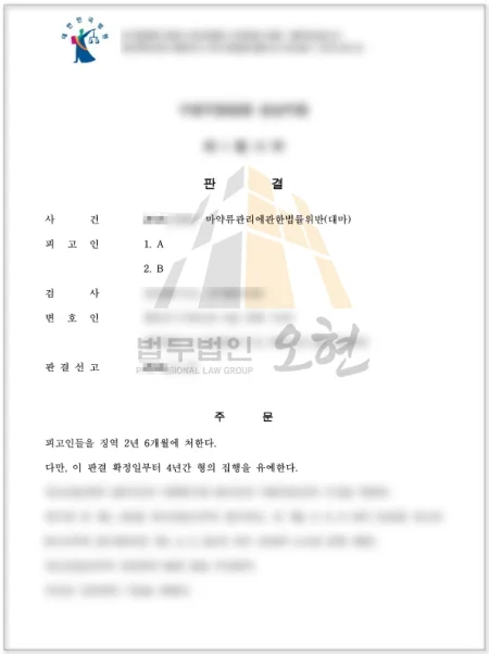 그 결과, 법원은 오현의 주장을 받아들였습니다. "비록 수입한 대마의 양이 적지 않으나, 전량 압수되어 사회적으로 유통되지 않았고 피고인이 초범인 점, 자신의 잘못을 깊이 뉘우치는 점"을 참작하여 징역 2년 6월에 집행유예 4년을 선고했습니다.